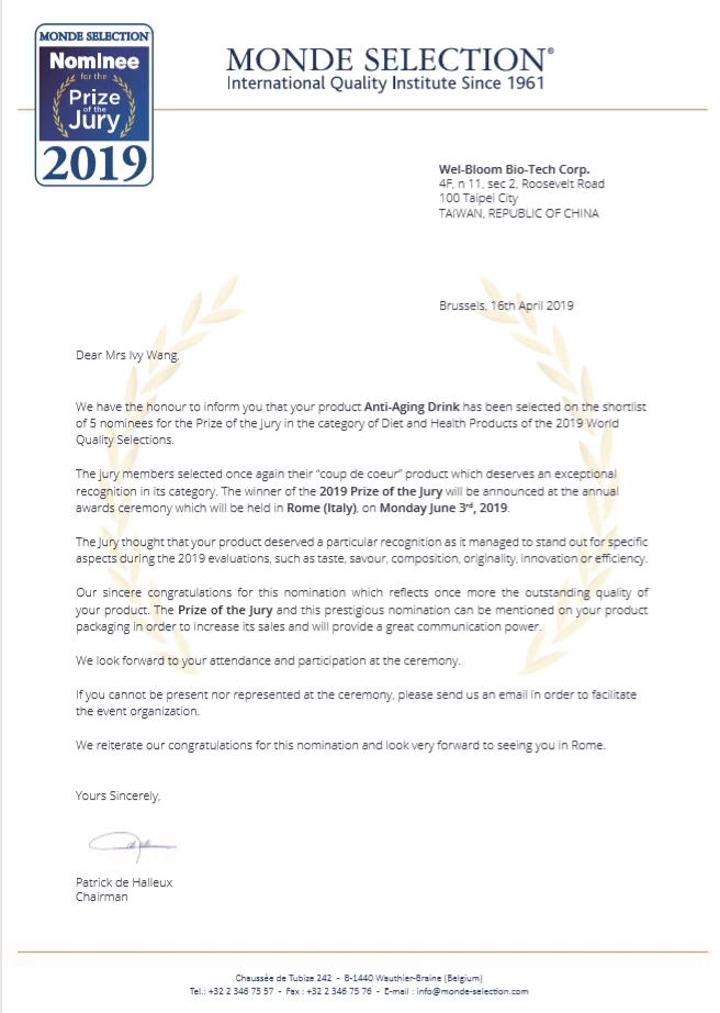 今天2019年世界品質評鑑大賞Monde Selection在羅馬舉辦了頒獎典禮,現場有上百家的廠商齊聚一堂,在頒獎典禮中,逢興生技送審的三樣產品榮獲一金一銀一銅的殊榮!其中獲得金獎的Anti-Aging Drink拾光飲,打敗上百家國際廠商,並以前五名之姿入圍評審大獎!能獲得世界品質評鑑大賞Monde Selection的獎項是對逢興生技的肯定!