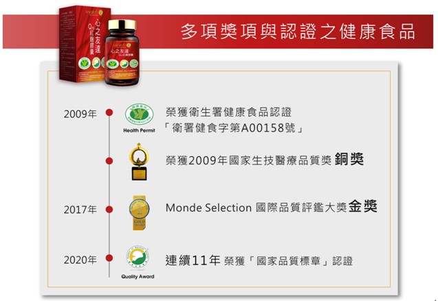 逢興生技心之友達Q10紅麴膠囊,除了獲得健康食品認證標章外,還受國內外認證及獎項肯定,已連續11年榮獲SNQ品質認證標章、國家生技醫療品質獎 銅獎及獲得譽為食品界奧林匹克之稱的Monde Selection國際品質大獎金獎。心之友達Q10紅麴膠囊臨床實驗證實三周內有效。逢興生技就是要用最好產品,幫你調整體質,增加防禦,助你打好身體基底。