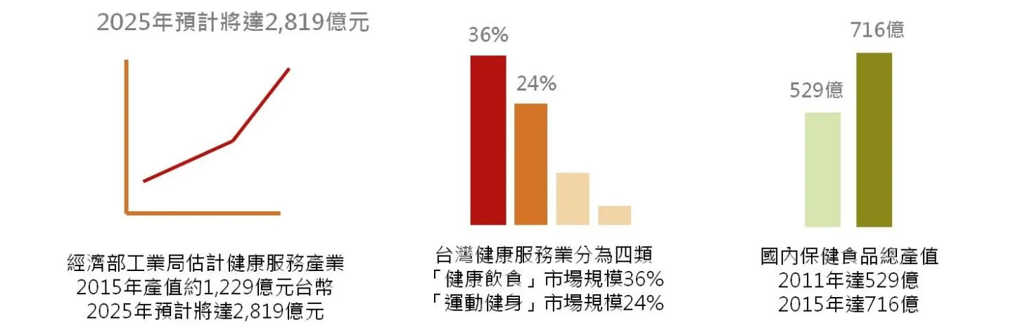 根據Datamonitor Healthcare的預測,未來十年美國減肥市場規模將從現在的5.33億美元增長為12億美元。中國大陸方面,目前肥胖人口達7,000萬,是成年人總數的14.6%,推估全國減肥市場容量應為677億元人民弊。在台灣市場也可看到健康浪潮的來勢洶洶,經濟部工業局估計健康服務產業2015年產值約1,229億元台幣,2025年預計將達2,819億元,10年將成長翻倍;台灣健康服務業可分為四大主軸,依據商業發展研究院2016年的調查指出:「健康飲食」以36%的市場規模佔比位居第一,「運動健身」佔24%次之,「健康管理」與「心靈健康」則居第三與第四名。
