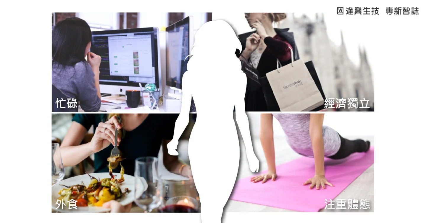 由前述分析可得知,國內進行減重或體重控制的主要客群是25~44歲的輕熟女和熟女。若依勞動部資料顯示該年齡層女性的勞動參與率75.6%~90.2%間(以五歲為統計區間,2015年資料),亦即國內這些減重或體重控制的主客群,八成以上為女性上班族。因上班族職業婦女普遍有工作家庭兩頭忙碌、外食、注重體態、經濟獨立等特性,如何配合她們生活型態提供體重控制產品,便成為產品能否成功十分重要的課題。