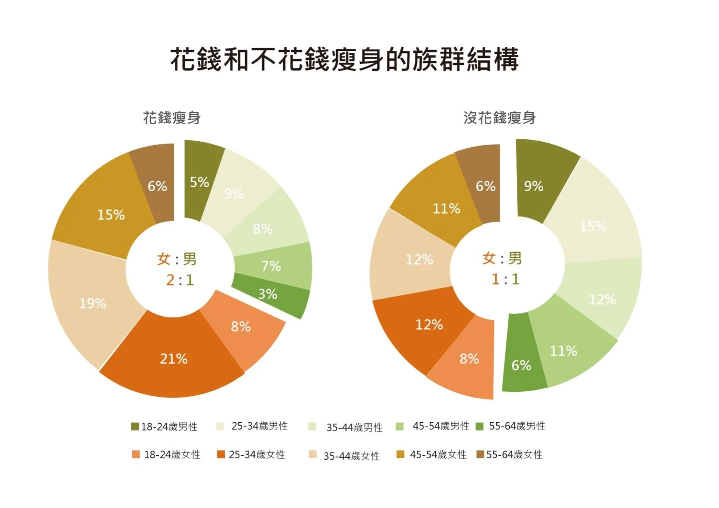 根據動腦網站協同tns模範市場研究公司所進行的瘦身經驗調查顯示,台灣地區18~64歲的民眾中超過58%有瘦身經驗,其中熟女(35~44歲)和輕熟女(25~34歲)曾經瘦身比例皆高達七成左右,且分別有33%~36%採用花錢方式進行瘦身,較其他年齡層女性20%~28%為高。至於在男性方面各年齡層有瘦身經驗比例約四至六成,採花錢方式進行瘦身僅介於9%~15%間,不但皆較同年齡層女性為低,且各年齡層男性間的差異相對較少,不如女性有特定年齡層偏好花錢瘦身的現象。