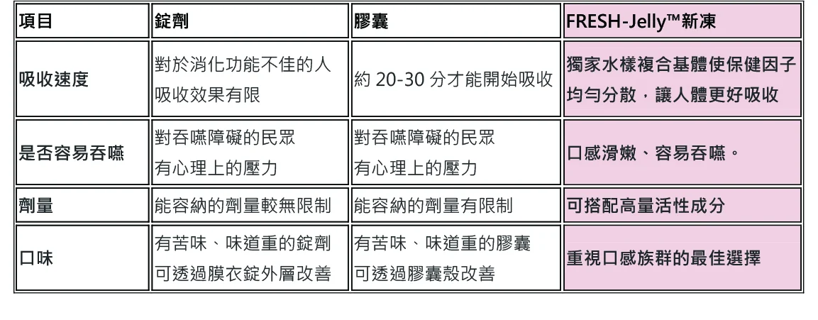 針對常見的錠劑、膠囊劑型與FRESH-Jelly™新凍的消費者適感性分析如下: