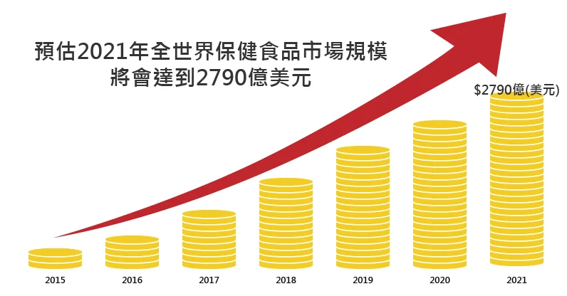據 Transparency Market Research預估,2015 年至2021年全球保健食品市場年平均複合成長率(CAGR)將可達7.3%,至2021 年其規模可達2,790億美元。其中機能性食品市場規模最大,達31%以上。目前市場雖以北美為主,但未來亞太地區巿場成長快速(尤其是中國與印度市場),將成為全球第二大的保健食品市場。隨著人口高齡化和生活型態疾病(如肥胖、糖尿病)的醫療開支日益增長,以及運動健身及健康減重風潮盛行,預期將成為加速消費者購買保健食品的關鍵動力。