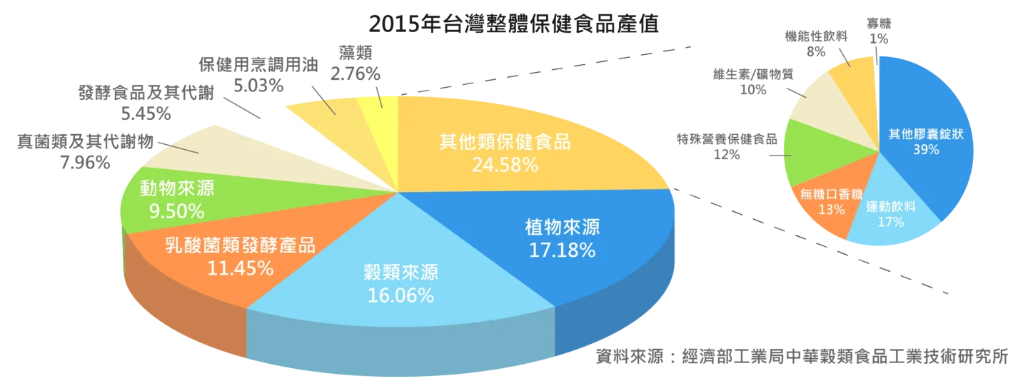 台灣2015年整體保健食品產值716億元中,乳酸菌類發酵產品產值約82億元、發酵食品或代謝物約39億元、真菌類及其代謝物約57億元、藻類產品約20億、植物來源產品約123億元、穀類產品來源約115億元、保健油品約36億元、動物來源產品約68億元、其它類保健食品(包括其他膠囊錠狀、無糖口香糖、運動飲料、維他命或礦物質、機能性飲料、寡糖以及特殊營養保健食品等製劑或產品)產值約176億元。