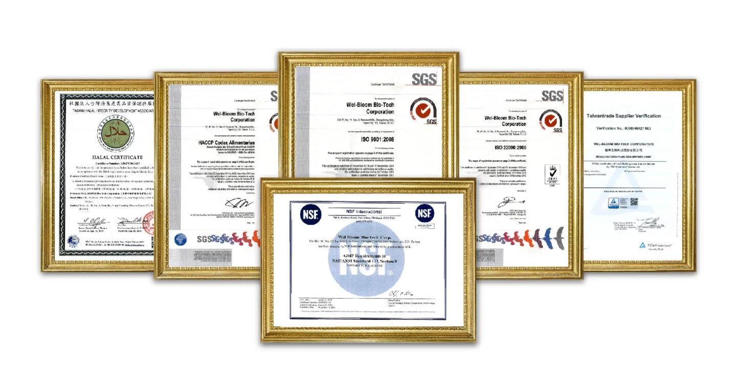 逢興生技擁有ISO9001/ISO22000/HACCP等國際品保認證,FRESH-Jelly™新凍產線不只取得了審核程序十分嚴謹的Halal清真認證,更利用僅僅半年時間內取得世界級標竿認證-美國NSF-GMP,成為了台灣第一家取得GMP認證的機能型晶凍專業食品廠。