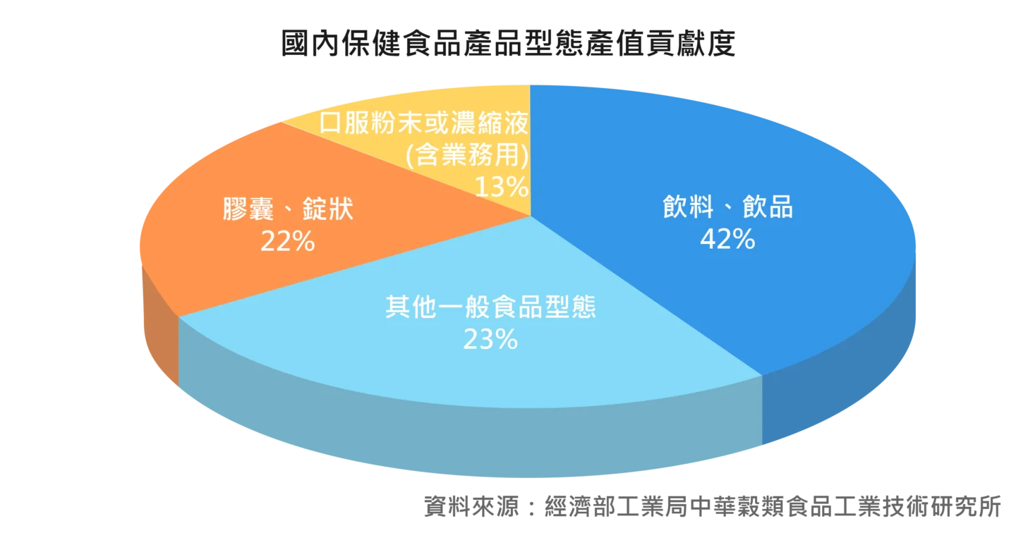 以國內保健食品產品型態推估產值,其中飲料、飲品佔最大宗品項約有42%、其他一般食品型態(泛指沖泡穀粉/片、奶粉、烹調油品、茶包、咖啡、糖果、口香糖、醋飲、麵條等)約佔23%。因此,傳統食用型態產品之產值貢獻度約達65%,膠囊、錠狀型態約佔22%。