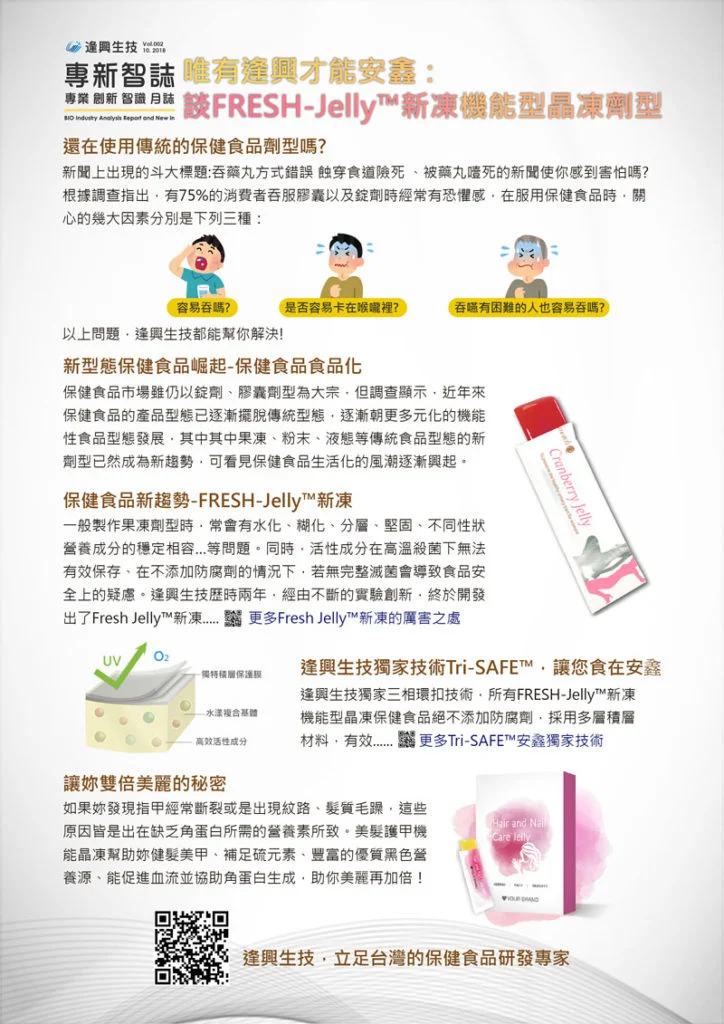 逢興生技獨家三相環扣技術,所有FRESH-Jelly™新凍機能型晶凍保健食品絕不添加防腐劑,採用多層積層材料,有效…… 更多Tri-SAFE™安心獨家技術