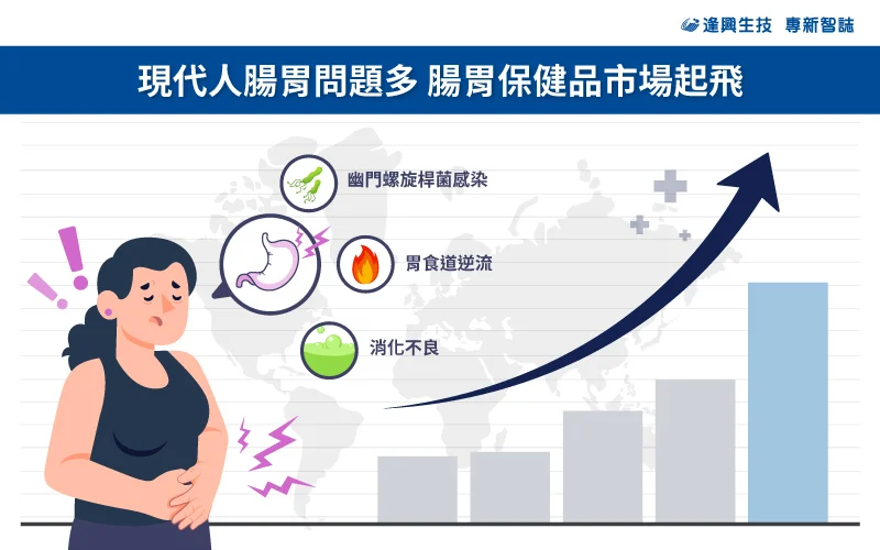 為了避免消化問題帶來其它的健康隱憂,民眾也會更重視腸胃保健與改善,加上腸胃不好易造成身材走樣,對於體型調整有需求的人群,就會更有尋求解方的迫切,帶動相關的營養補充與調理商機,因此相關保健食品需求逐年提高,破百億的保健食品市場前五大的主力功效產品,腸胃道保健就佔據其一[2]。除了常見的益生菌、也會選擇幫助食物分解、成分天然的消化酵素來幫助腸胃生態的改善,預計消化酵素的市場規模在2021年~2025年的預測期間內,預計將以6.09%的年複合成長率推移,並成長到7億6,318萬美元[3]。