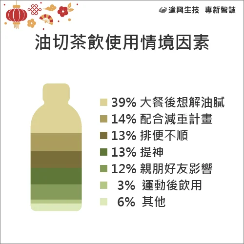 Brain.com動腦雜誌曾進行調查,消費者使用市售油切茶飲料的情境因素,主要是因為大餐後想解油膩(39%)、及配合減重計畫(14%)、排便不順(13%)、提神(13%)、親朋好友影響(12%)、運動後飲用(3%)、其他(6%)。