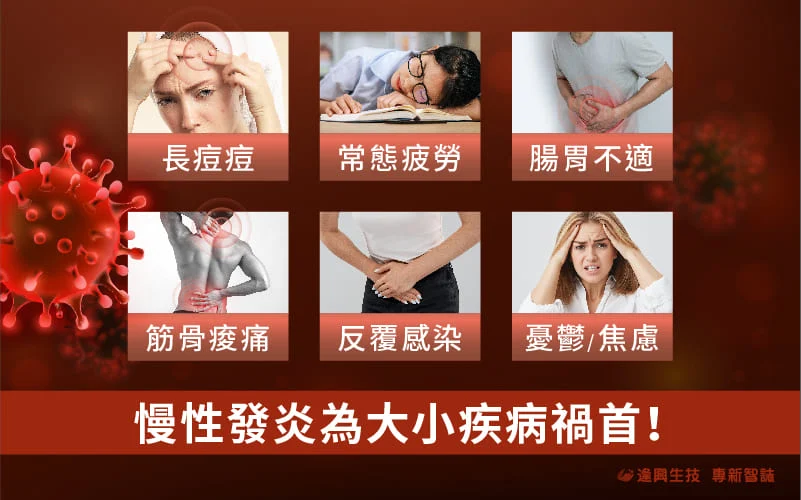 忙碌的現代人,容易產生長時間疲勞、肌肉痠痛、腸胃差、容易感冒等宿疾,甚至不時呈現皮膚蠟黃、長痘痘的狀態,稍作休息症狀也無法緩解,身體越來越懨懨無力、難以提振精神,以上都有可能是「發炎」作祟;研究顯示超過50%的疾病都跟發炎相關,我們所熟知的三高等心血管疾病、國人致死率高的癌症,像是肝癌、胰臟癌、大腸癌,也都與慢性發炎下的阻塞、淤積大有關聯[1],由於發炎容易潛伏體內,又沒有明顯的症狀,卻又持續的傷害健康組織,因此時代雜誌將發炎喻為「神秘殺手[2]」。