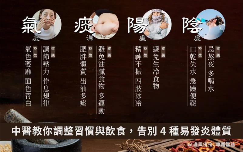從中醫的觀點來看,發炎是因為體內不平衡,沒有能力將體內的濕、熱排出,因此容易引發發炎體質症狀[6][7],又可以細分為四種類型: