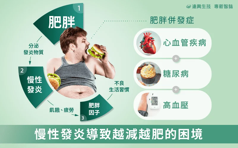 肥胖已被證實是許多慢性疾病的危害因子,而這之間的關係是因為肥胖會導致人體處於發炎的狀態。當攝取過多熱量會造成脂肪組織異常的擴充,在這過程中會分泌許多的發炎物質,如 TNF-α 及 IL-6 等,當這些物質無法達生理平衡狀態時,就會產生發炎反應。形成慢性發炎和肥胖兩者不斷相互影響的惡性循環。[4][5]若未從根本原因解決,長久下來可能會導致越減越肥且衍生出肥胖併發症,讓身體每況愈下。