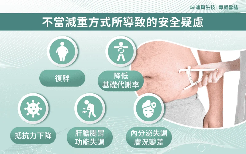 肥胖被認為是一種慢性病,除了運動、改善生活習慣之外,有些人也會以手術、藥物來減重,然而這些快速減重的極端方式,卻存在不少人體健康安全的疑慮,如下列[6]:
