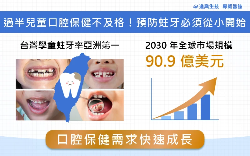 台灣教育部國教署2020年的調查顯示,國中小學童齲齒盛行率高達54.83%[3],衛福部也統計12歲學童恆齒蛀牙數平均為2.01顆,高於全球平均及日韓等鄰國[4]。所幸近年政府積極推廣勤勞潔牙、定期塗氟、控管糖分攝取等衛教知識,蛀牙平均顆數正逐年下降,加上少子化影響,家長對兒童口腔保健的重視度也逐漸提升,全球相關市場規模有望在2032年達90.9億美元[5]