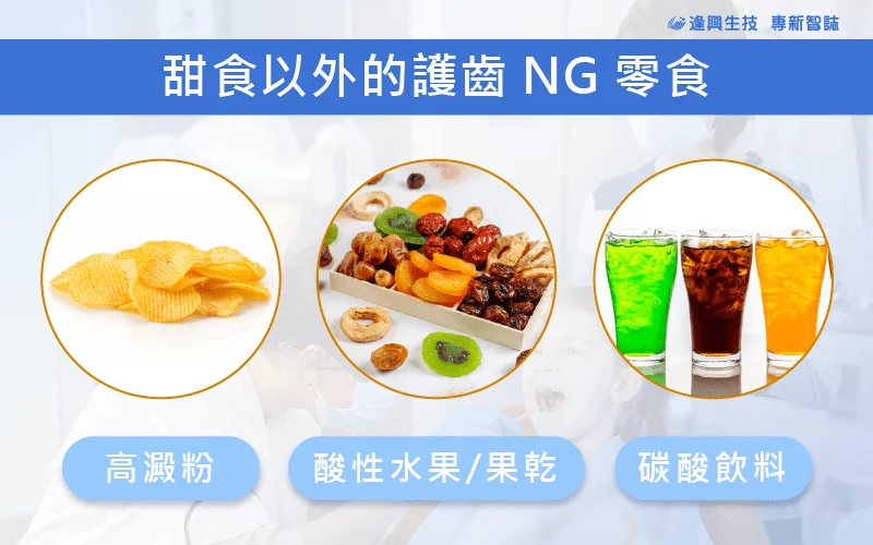 另外一個蛀牙迷思是「糖吃太多」,雖然甜食因其黏性較高,比起鹹食更不易清潔,容易殘留在牙齒表面,但事實上甜鹹食都有可能造成蛀牙,為此專家建議調整飲食內容,除了高糖之外,也盡量避免洋芋片、蛋糕等高澱粉零食,同時限制酸性水果、果乾、碳酸飲料的攝取量[6],現今零食種類不斷推陳出新[7],很難從生活中完全隔絕,家長們可選擇營養豐富、低糖的口腔護理膏或軟糖,替代一部分日常零食,避免孩子私底下偷吃或報復性吃糖,同時滿足口腹之慾和維持口腔健康的目的。